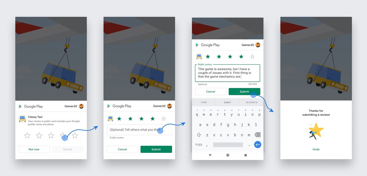// - 우수한 사용자 환경을 제공하기 위해 Google Play는 사용자에게 리뷰 대화상자를 표시할 수 있는 빈도에 관한 시간제한 할당량을 적용합니다.