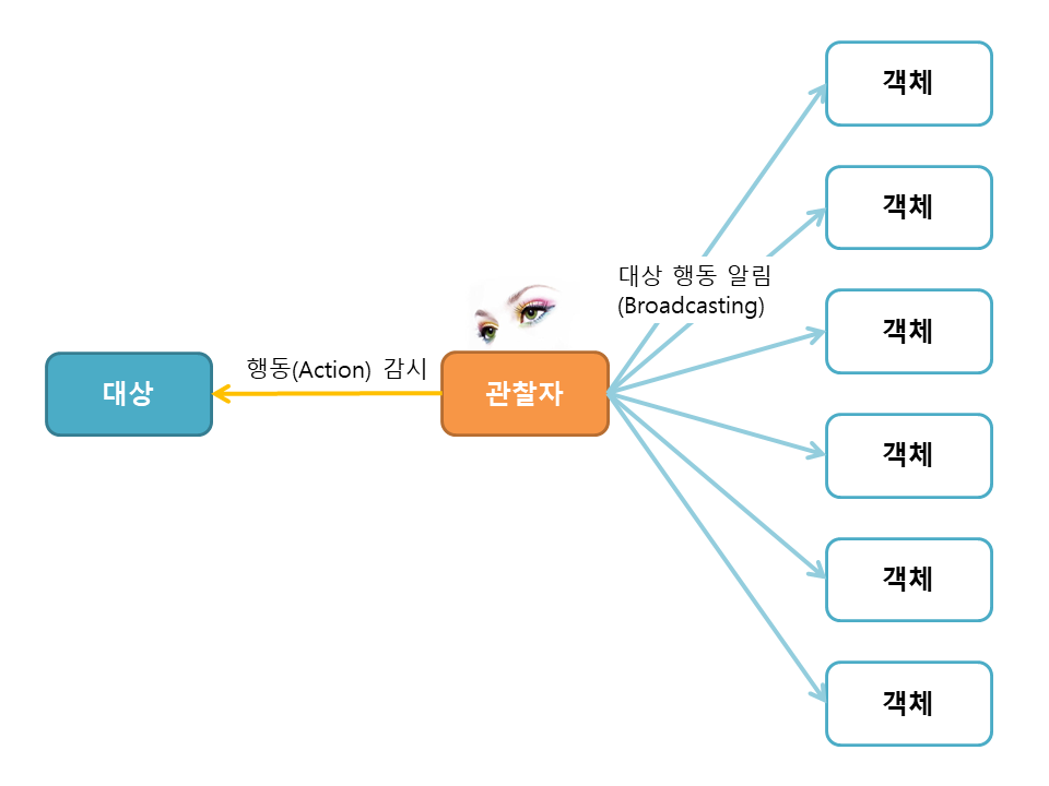 대상의 특정 행위가 일어나면 관찰자가 구독 중인 객체에게 브로드캐스팅(방송)하여 알려주는 패턴입니다.