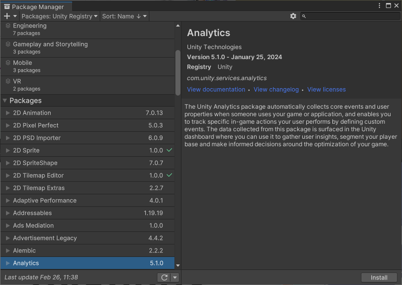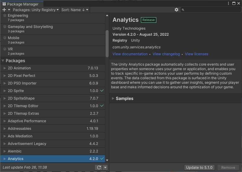 과거 버전에서 기본적으로 포함되어있는 유니티 패키지인데, 유니티 애널리틱스 정보가 없어서 원래 이상이 없었으나, 2021.3 (LTS) 버전 적용 이후에는 선택사항으로 바뀌면서, 과거 버전 패키지를 그대로 끌어다가 업데이트를 하니 프로젝트에 포함되어서 강제 선택 적용이되었습니다.