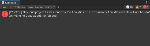 No cloud project ID was found by the Analytics SDK. This means Analytics events will not be sent. Please make sure to link your cloud project in the Unity editor to fix this problem.