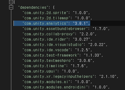 2. "com.unity.analytics": "3.8.1" 한줄을 지우고 저장합니다.