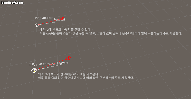 Handles.Label(owner.position + Vector3.down * 0.5f, "내적, 2개 백터의 사잇각을 구할 수 있다.\n" +