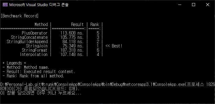 보간방법(Interpolation; $)과 오퍼레이터 및 이어붙이기(+)방식은 사용하기는 매우 편하지만, 퍼포먼스가 떨어진다는 것을 알 수 있습니다. 꼭 필요하다면 단발성으로 쓰는 경우에만 사용하는 것이 좋겠습니다.