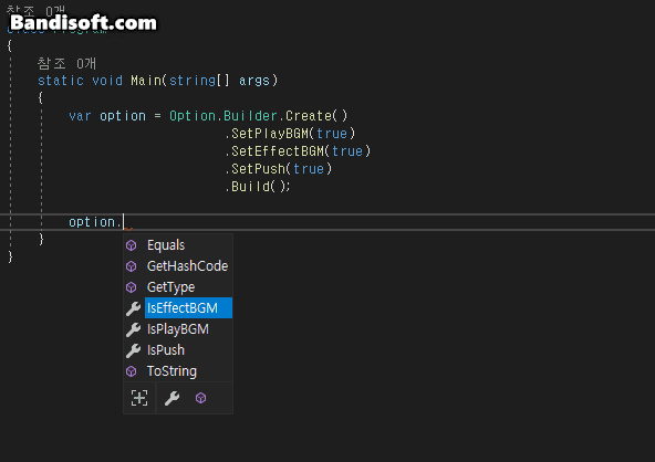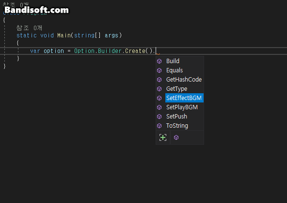 앞서 보시다시피, Option 클래스 내부에는 Build 클래스라는 설계도 클래스가 있습니다. 생성 시, 설계도 클래스를 이용하여 직관적으로 이용가능합니다. 작성을 할 때는, 빌드 클래스를 따로 선언해주고 Setter들을 따로 만들어 준다는 개념으로 접근하면 됩니다.