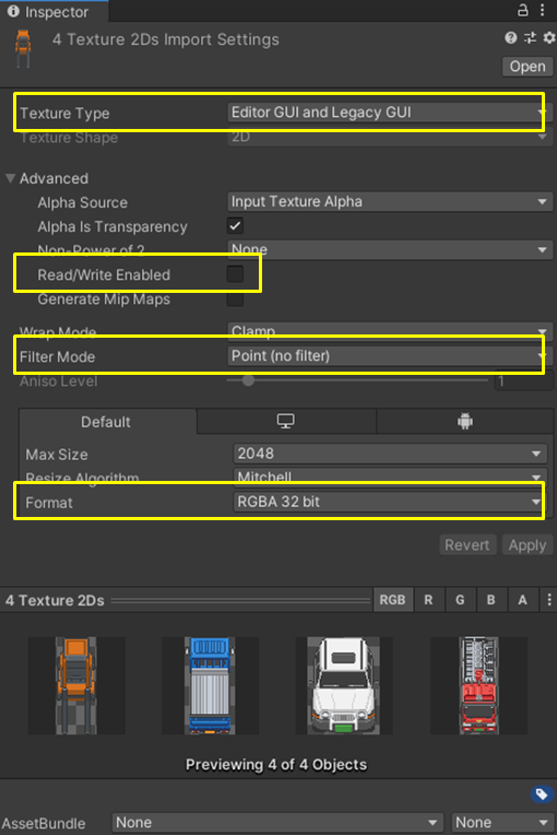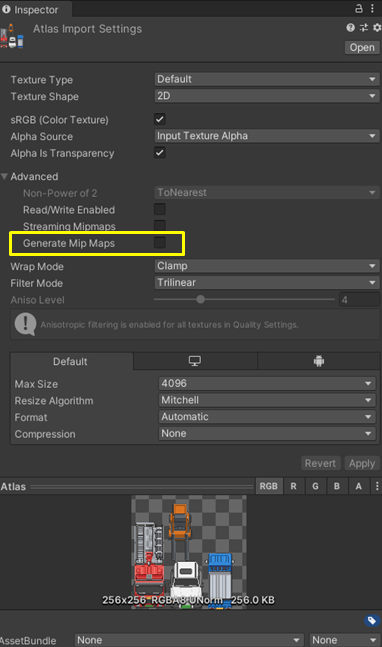 - 스크립트로 해당 텍스쳐의 픽셀을 읽을 때, 해당 기능이 체크되어야하는 부분이기에 해제, 해제를 해야 상시 메모리 절약을 할 수 있다. 아틀라스 화질과는 무관한 옵션 - Filter Mode: Point (no fiter)