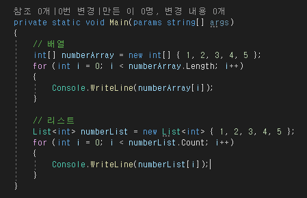 차이가 없는 두 가지 타입의 데이터 형식, 하지만 내부적으로 작동하는 방식이 다릅니다. 여기서 재밌는 점은 Array는 Length를 쓰고, List는 Count를 쓰는 차이가 있는데, 앞서 설명했던 이유들로 인해 사용하는 용어 차이가 있습니다.
