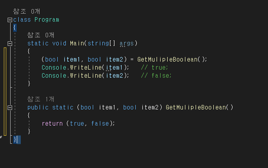 튜플(Tuple)은 여러 개의 결과 값을 받아올 수 있으며, 일반적인 함수 구조에 가깝습니다. out 문법보다는 상대적으로 가독성이 높습니다.